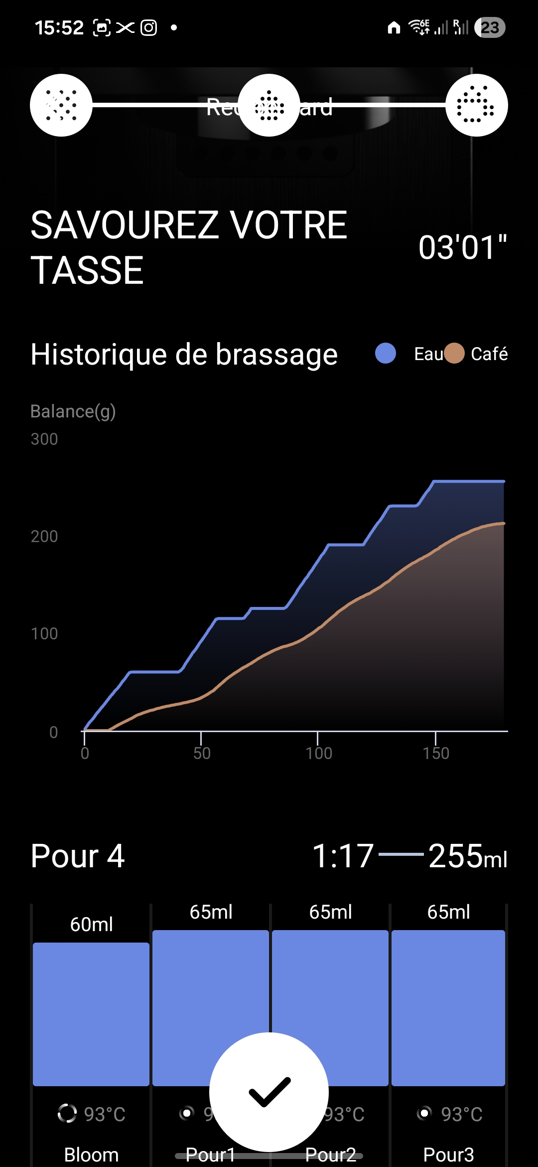 Der Wermutstropfen: Die App hat einige Bugs, und manche Updates haben Regressionen eingeführt (Verlust von Steuerungen, Verzögerungen, manchmal dichte Benutzeroberfläche). Aber xBloom zeigt sich reaktionsschnell: Der Hersteller veröffentlicht regelmäßig Updates, und die Einführung des Auto-Modus — Rezepte, die direkt von der Maschine aus gestartet werden — ist ein konkretes Beispiel für eine Funktion, die aus Nutzerfeedback entstanden ist.