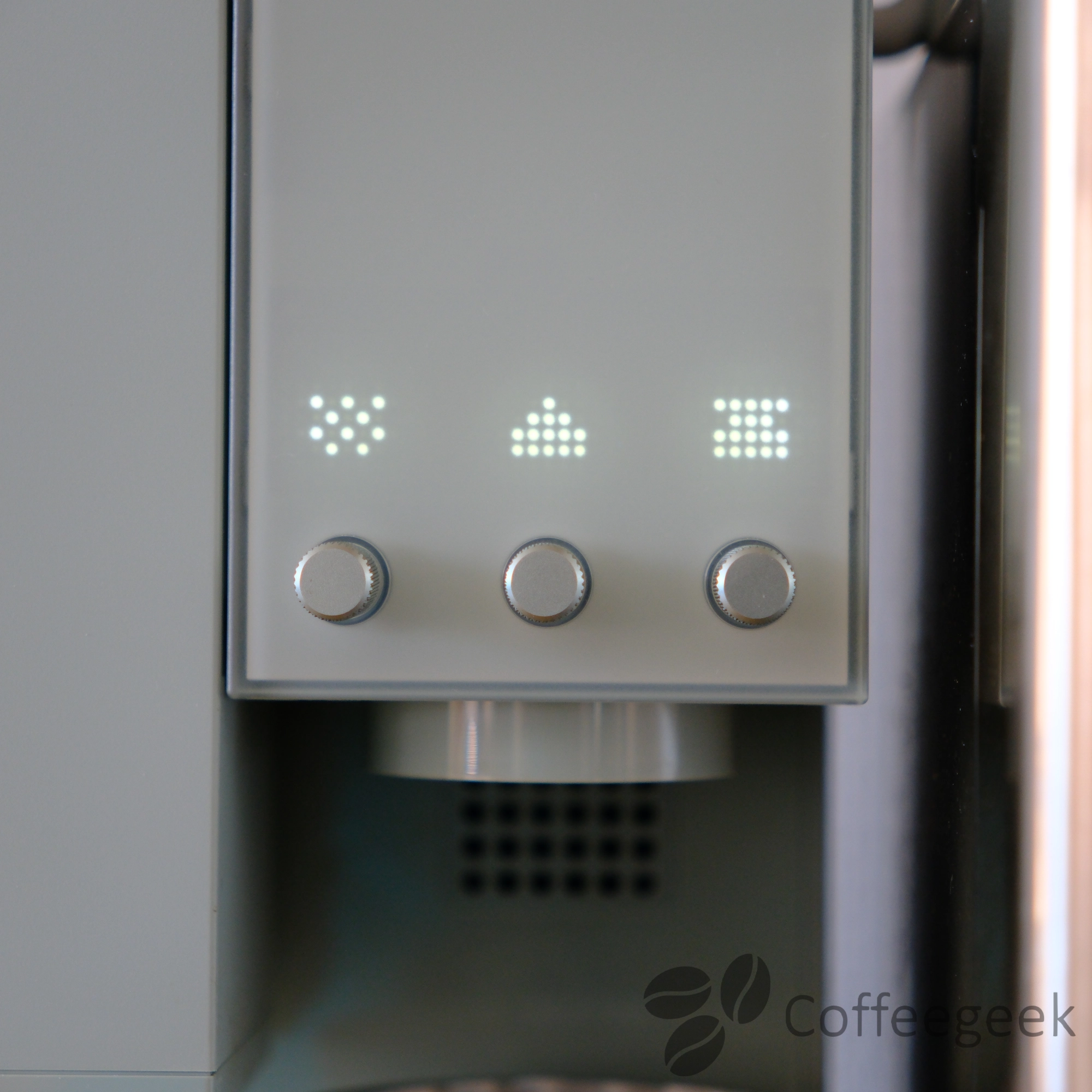 - Linker Drehregler: Steuerung der Mühle (Mahlgrad, Mahlgeschwindigkeit)