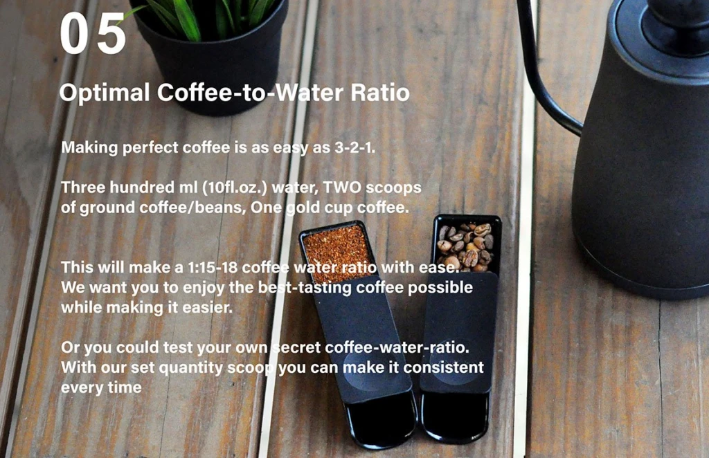 Die Marke gibt an, dass der Löffel für die Dosierung des V60 optimiert ist: 2 Löffel Kaffee für 300 ml Wasser = 1 Tasse.