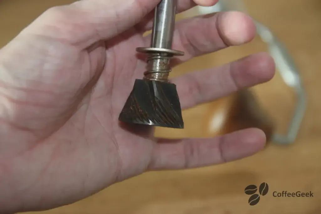 To disassemble the 1Zpresso J-Ultra, simply unscrew the nut holding the central shaft while blocking the burr with your finger, then remove the burr. Next, using the brush and pump provided, you can clean the grinder.