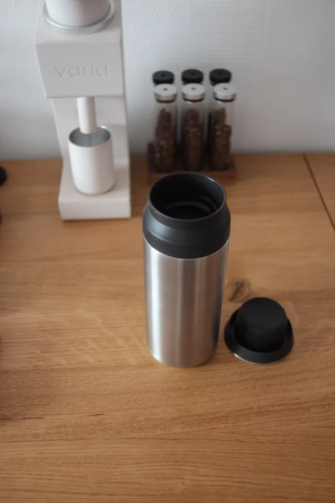 Kinto offers here a product with a different ideology from the thermos. It's more of an insulated tumbler, because once the upper part is unscrewed, you can drink all around without using an "ON/OFF" system like on the thermos with its pouring cap. Kinto has also added an "ice blocker" to prevent ice cubes from interfering when consuming cold drinks. The Kinto is reminiscent of the NOMAD insulated cup from Nespresso. Once unlocked, you can drink from all sides, like with a cup, which is very practical for long hours of work in front of a computer. This way, you always have a hot drink even after several hours.