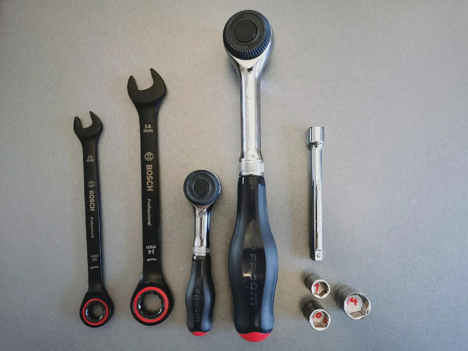 Three wrenches are needed: 9 mm, 10 mm and 14 mm (open-end wrench required for the 14 mm).