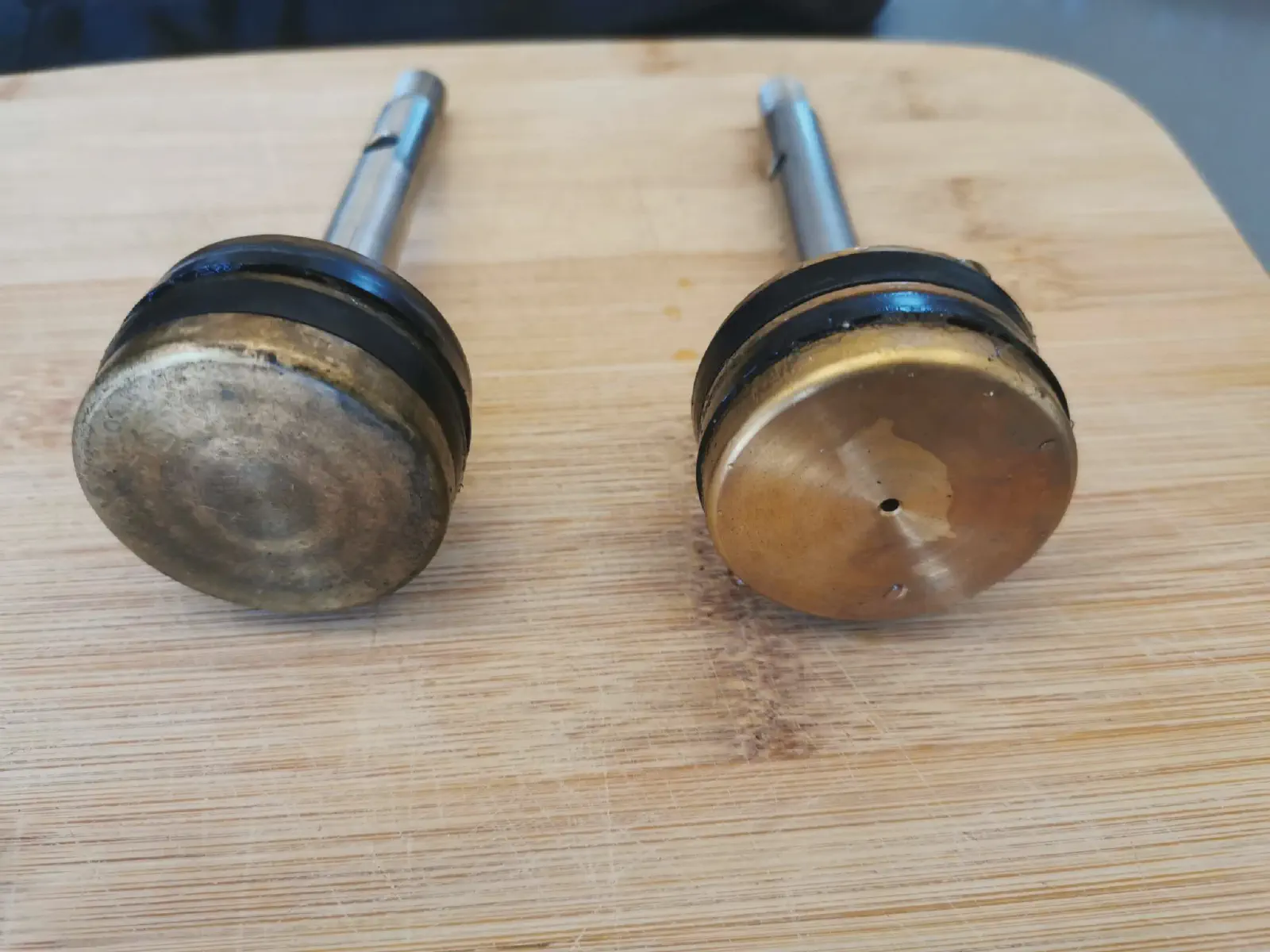 The installation begins by removing the lever and original piston, then greasing and inserting the new brass piston.