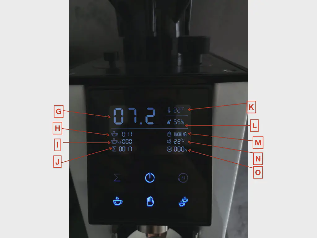 - G: timer for single cup / double cup or stopwatch in manual mode.