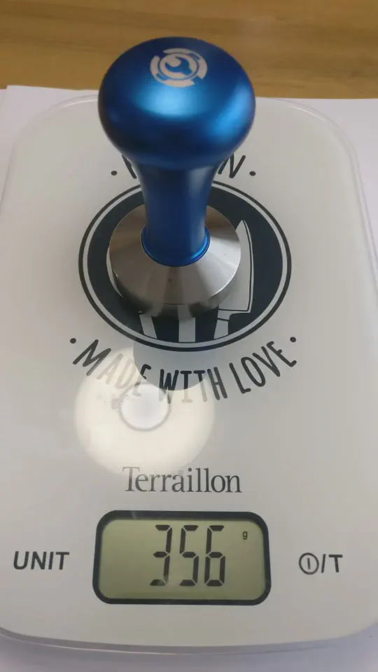 Generally, a tamper with an aluminum or wooden handle weighs around 400 g.