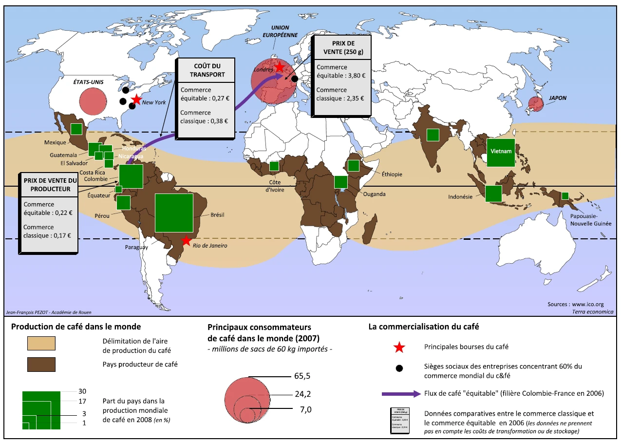 El Arábica crece en altitud (200 a 2000 m) alrededor del ecuador. Más frágil que el Robusta, está amenazado por el calentamiento climático.