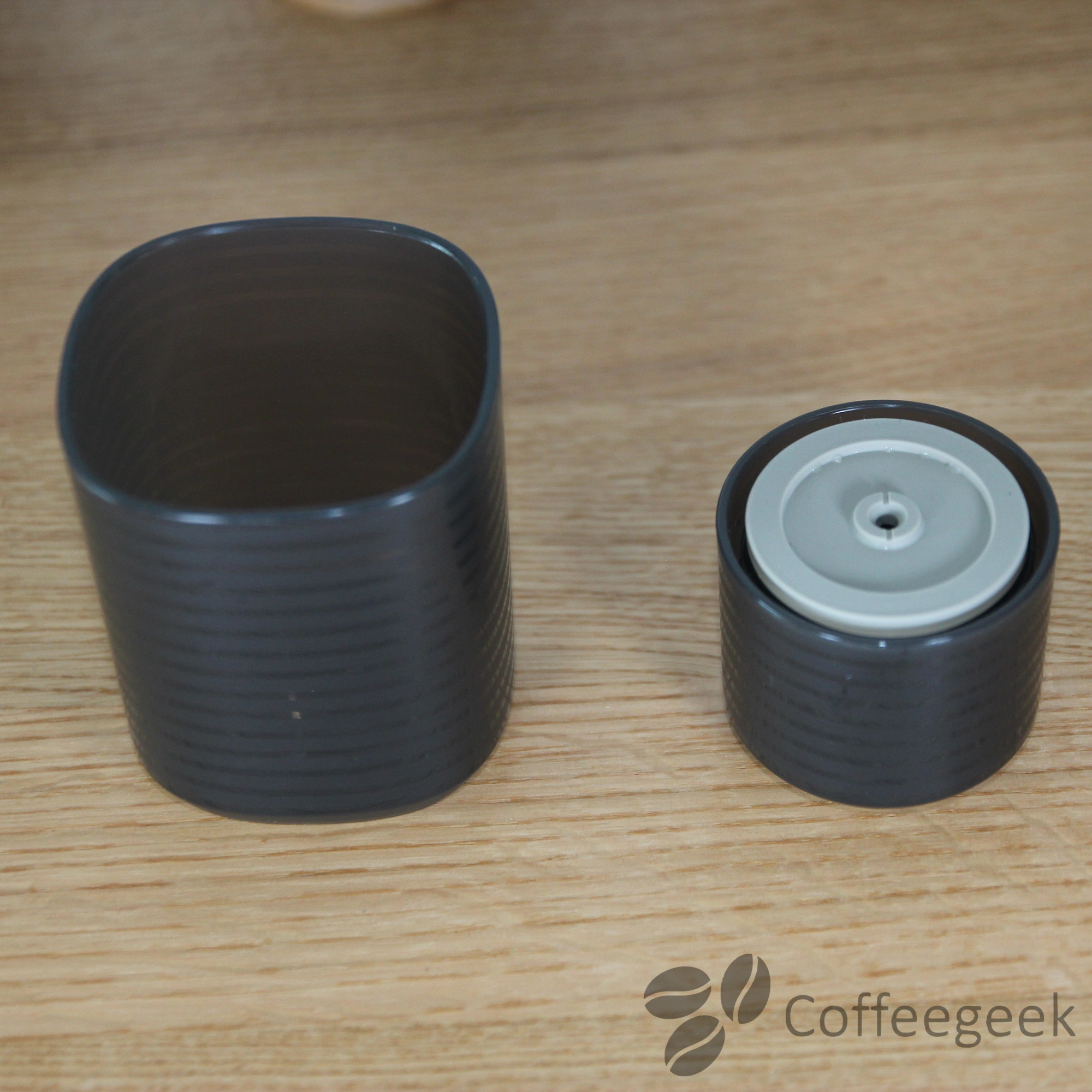 La Wacaco Pixapresso dispone de dos recipientes: uno que puede guardarse en el depósito, y el otro que sirve de tapa protectora.