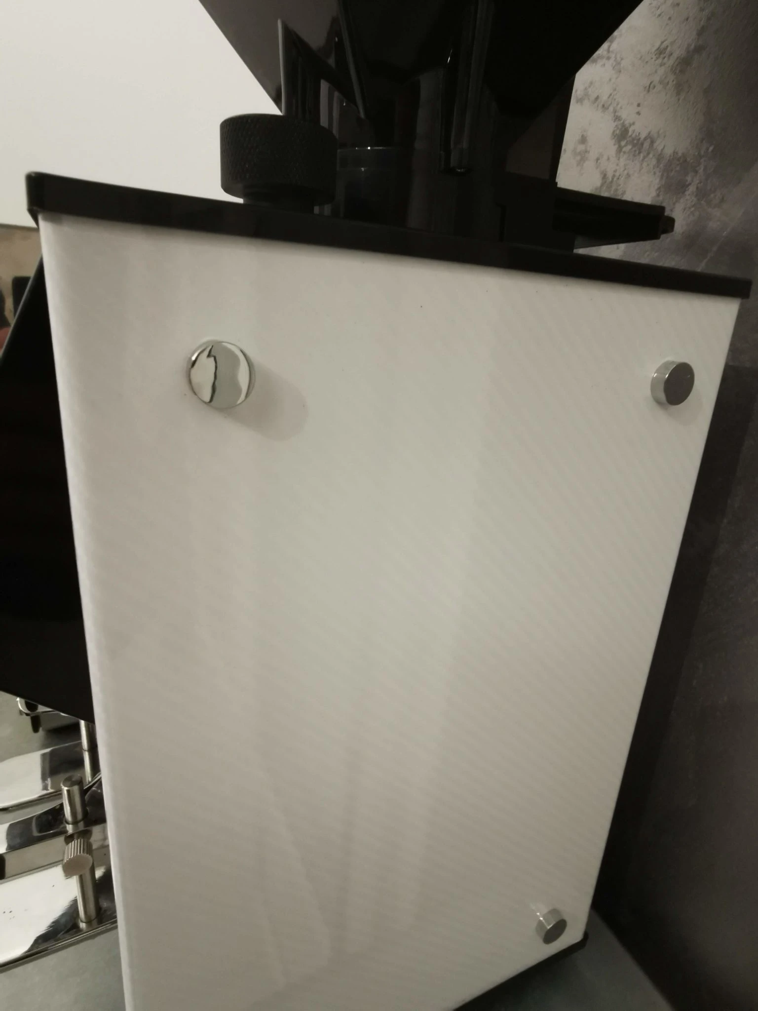 Mi modelo combina cromado y blanco texturizado. Aunque no elegí los colores (ya que el molino había sido utilizado en el salón de Milán), encuentro este acabado muy elegante. El blanco ligeramente adamascado aporta un toque único, y el cromado es de hermosa calidad.