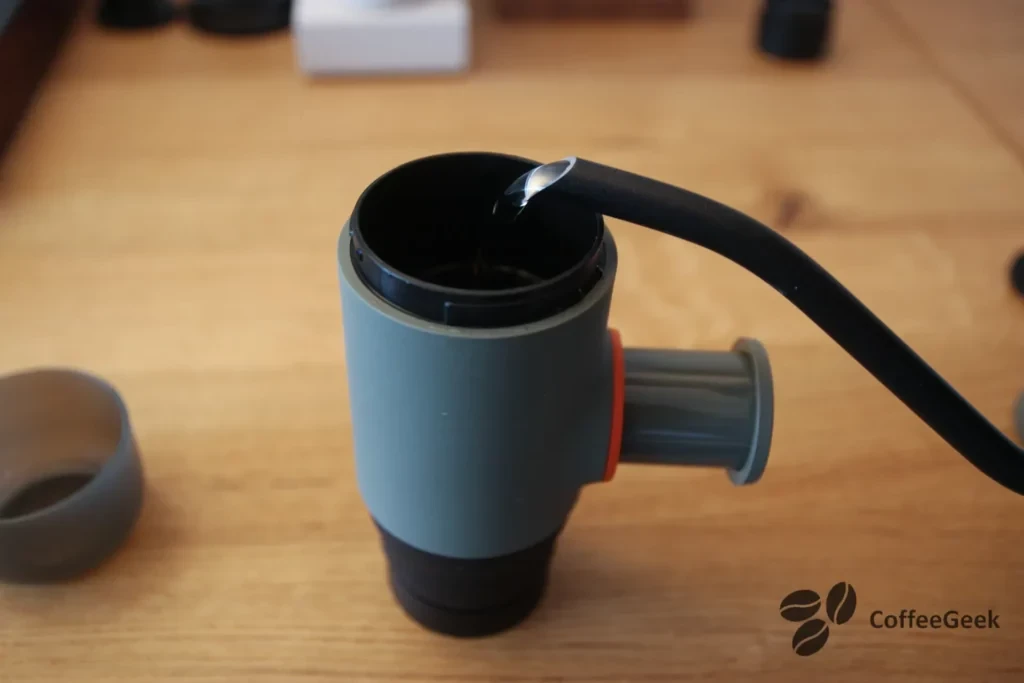 GR2にポルタフィルターをねじ込み、リザーバーにお湯を追加し、蓋を閉めてからポンピングします。