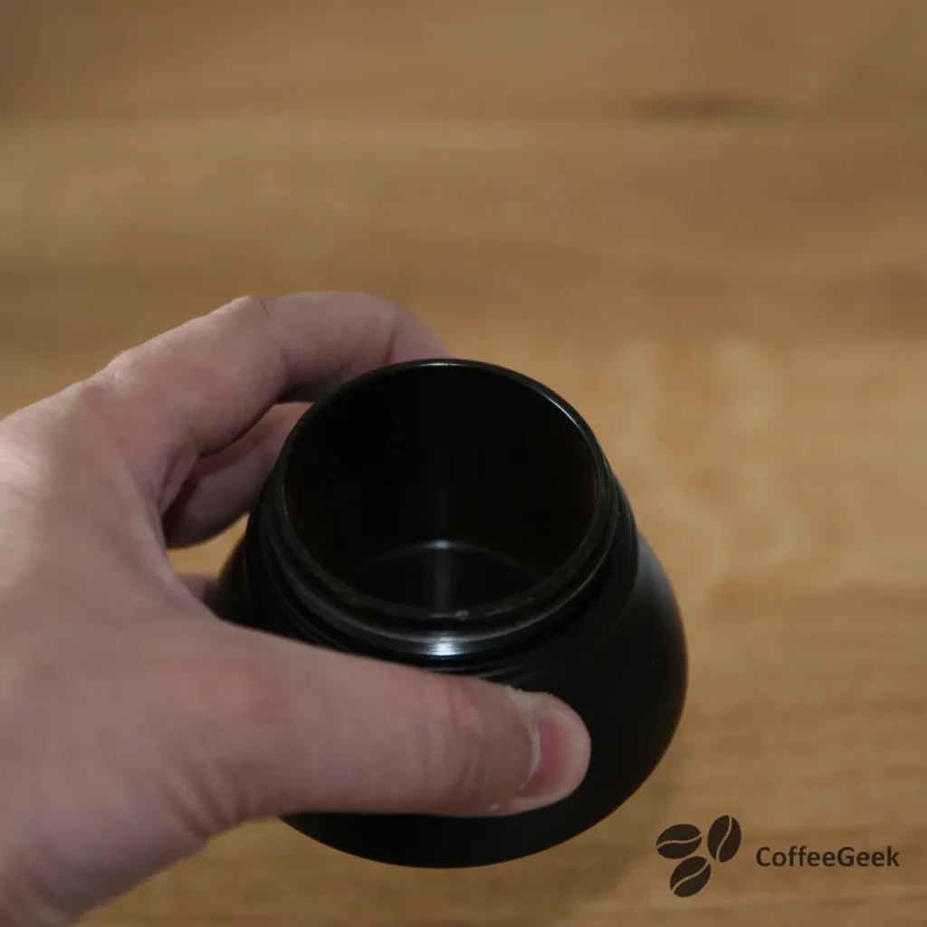 さて、本題に戻りましょう。ミル本体が上部はより絞られているのに対し、下部は漏斗状になっているという事実には二重の利点があります。漏斗は、使用中にミルを逃がさないようにしながら、ミルにコーヒーを注ぐのに役立ちます。