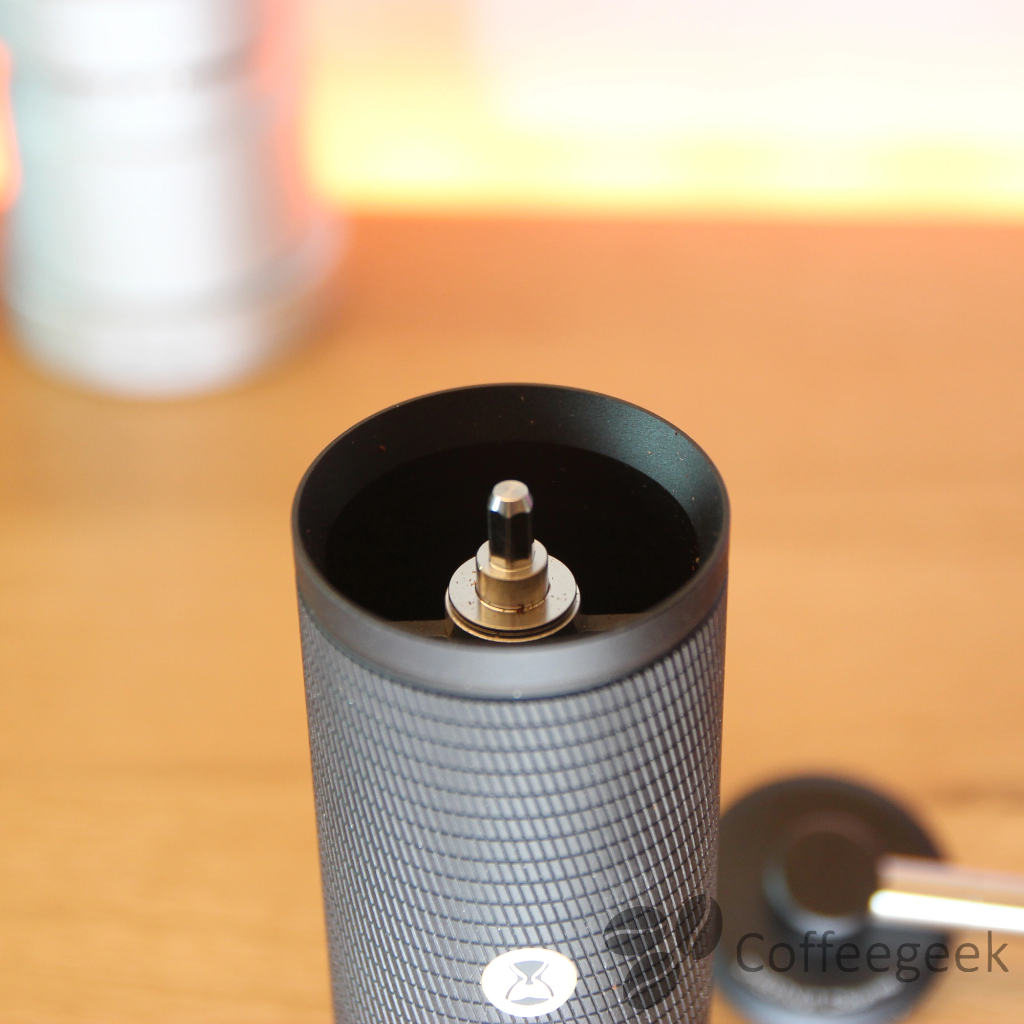 ミルの上部の大きな開口部には軽いじょうごが組み込まれており、豆の投入が容易になっています。手で注意して入れるか、手でじょうごの形を作る必要がある他のモデルとは異なり、このようなディテールがユーザーエクスペリエンスを向上させます。