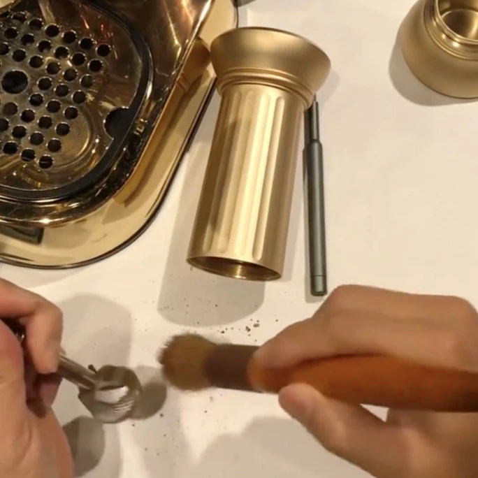 Bij de Kinu M47 heeft de koffie de neiging om aan de container te kleven, waardoor tikken nodig is om het los te maken.
