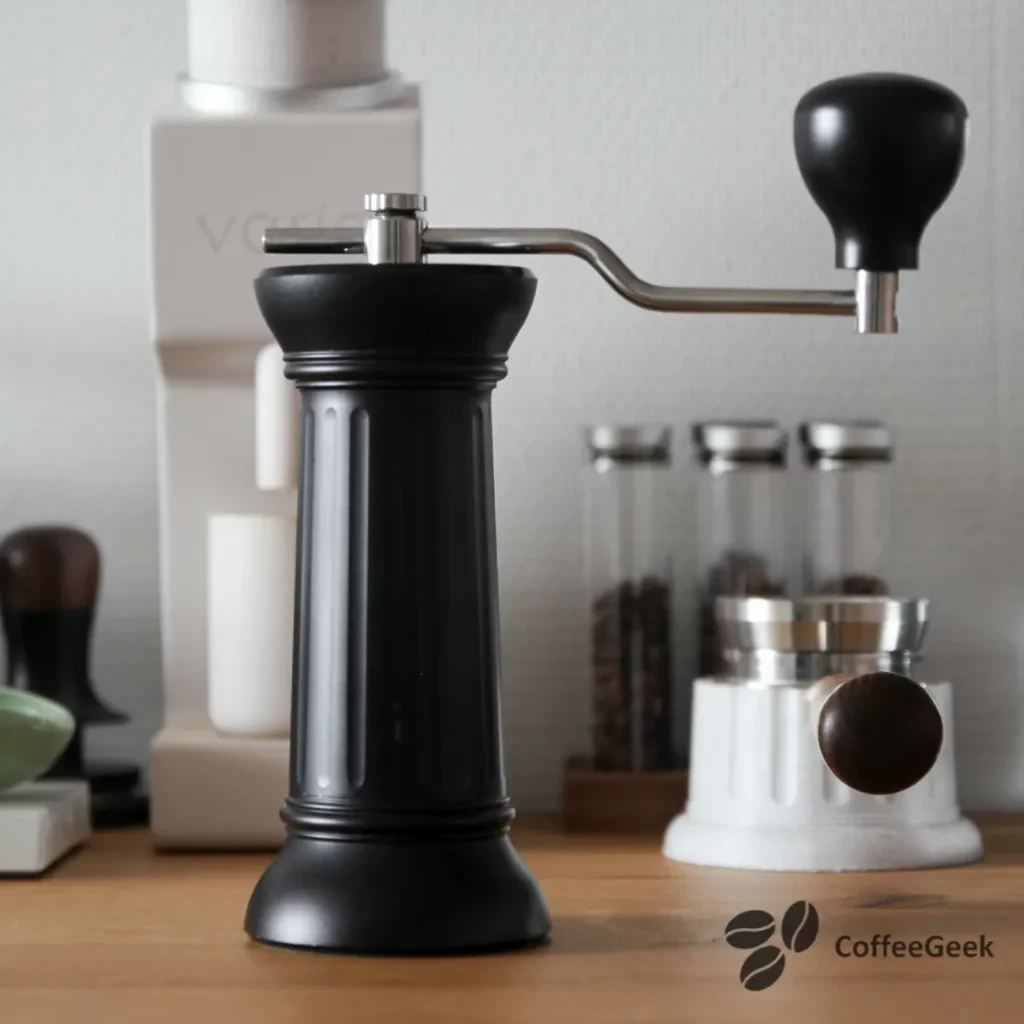 De slinger van deze molen is niet inklapsbaar en de knop is groot, van metaal, en biedt een uitstekende grip. Ik benadruk dit punt omdat ik de koffiemolen van MHW 3Bomber, Kinu of nog de Timemore S3 heb getest, die een veel kleinere slingerknop hebben. Persoonlijk vind ik dat de grip minder aangenaam is wanneer deze te klein is.