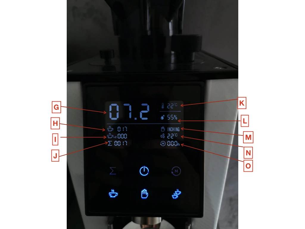 - G : timer dla jednej filiżanki / dwóch filiżanek lub stoper w trybie ręcznym.