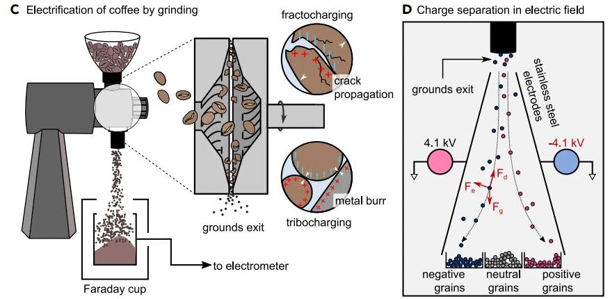 I sin forskning använde artikelförfattarna en kaffekvarn EK43 utrustad med två plattor vid utgången: en positivt laddad och en negativt laddad. Denna konfiguration gjorde det möjligt för dem att exakt kvantifiera proportionerna av positivt laddad, negativt laddad och neutral malning.
