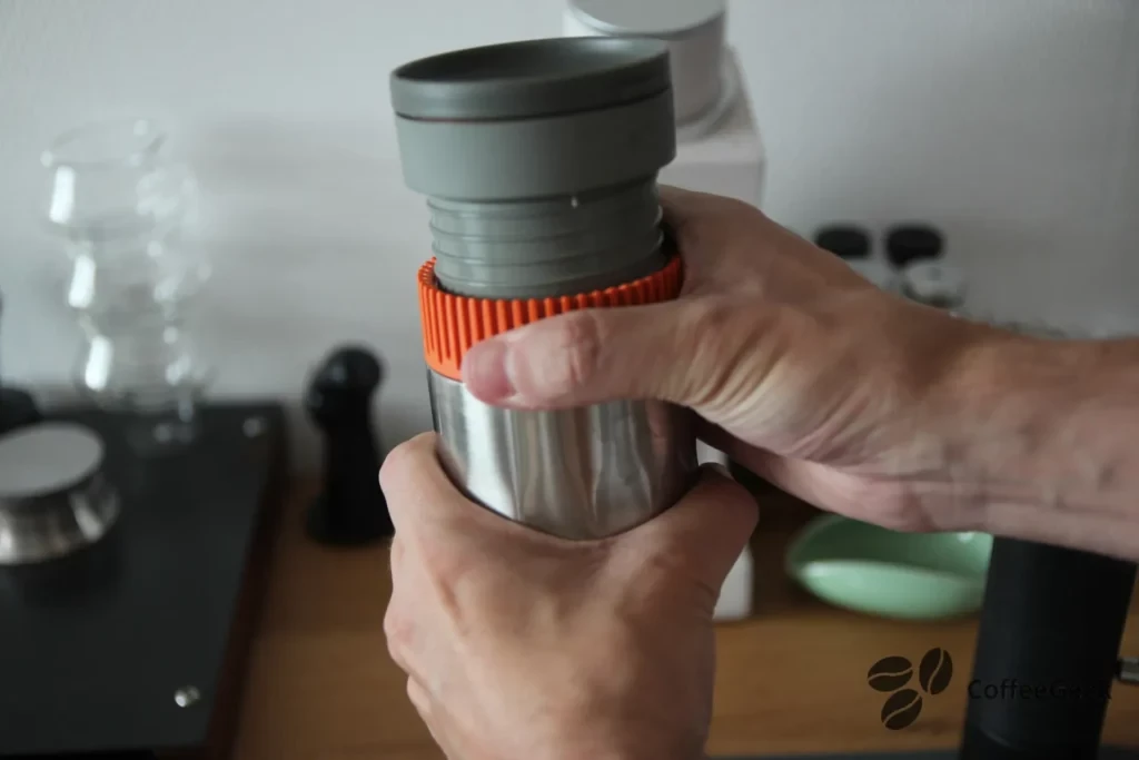 /timemoreeu.com/coffeegeek)**, har behållaren ingen invändig kant som kan orsaka kafferetention. Dessutom är dess vikt tillräcklig för att stabilisera kvarnen genom att sänka dess tyngdpunkt. Till skillnad från andra modeller som de från 1Zpresso, fästs behållaren genom att skruvas fast, vilket bidrar till dess robusthet.