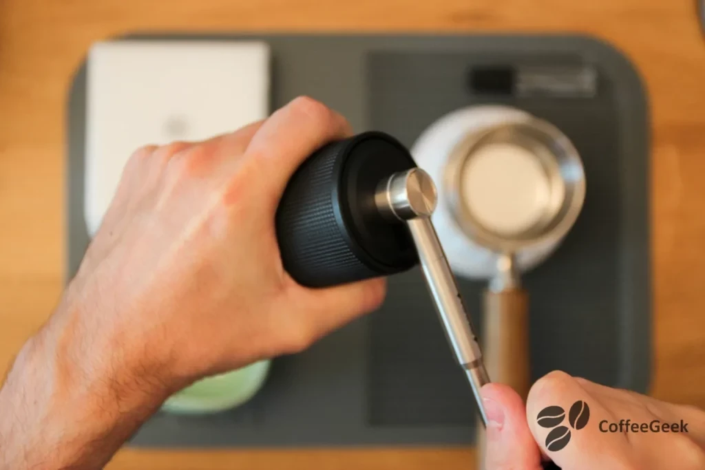 Veven är helt i metall (rostfritt stål) och fäst vid locket i aluminium. Trots sin kompakta storlek erbjuder handtaget på Timemore C3 ESP Pro ett utmärkt grepp och är utrustad med ett kullager, till skillnad från klippsystemet som används av konkurrerande märken som 1Zpresso, Kingrinder eller El Comandante C40. Detta garanterar, utöver en exemplarisk tillverkningskvalitet, att handtaget inte lossnar oavsiktligt från veven.