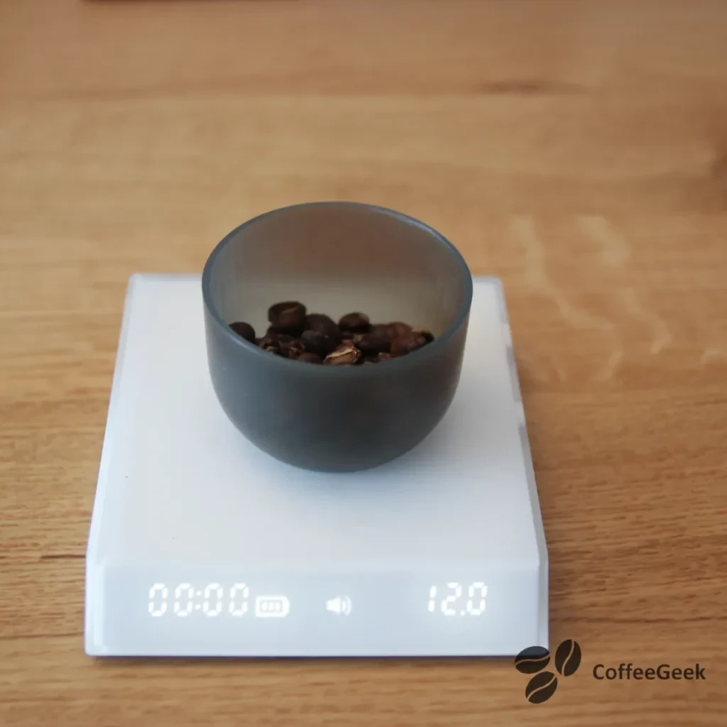 För att brygga mitt kaffe väger jag 12g bönor, som jag sedan maler med min resekaffkvarn, Timemore ESP C3. Under tiden värms vattnet i en vattenkokare.