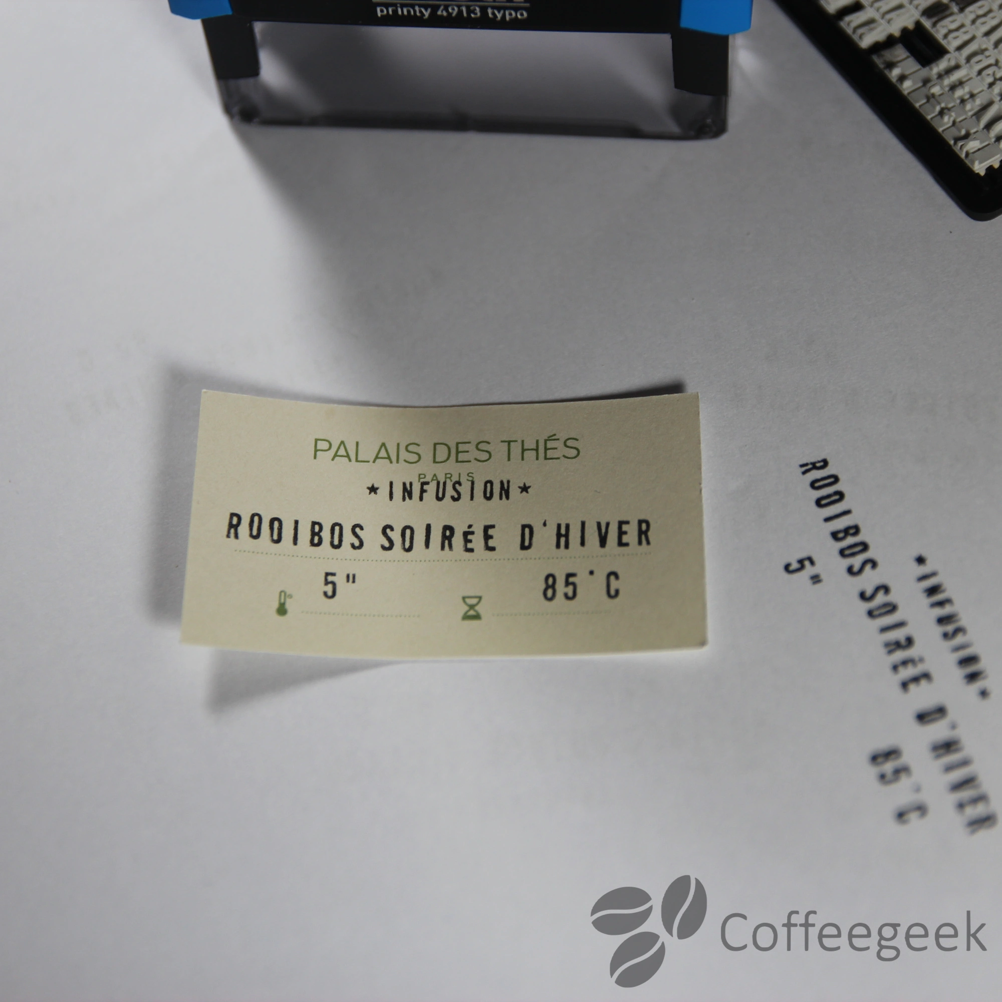 När jag är nöjd med testet stämplar jag den tomma etiketten från Palais des Thés. Det krävs en bestämd men inte för hårt tryckt rörelse för att få ett rent resultat.