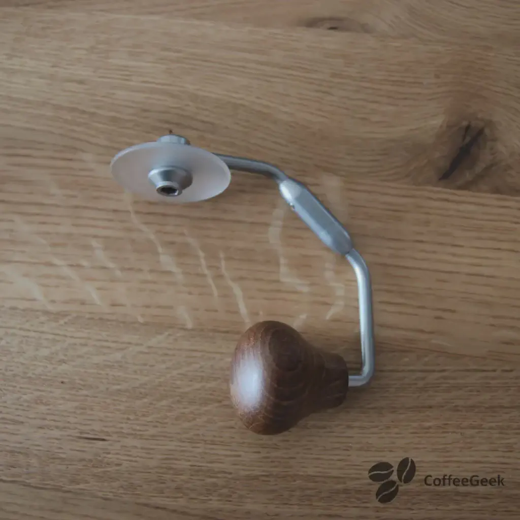 Then, I unfold the crank and start grinding. To give you an idea, to grind 18g of coffee with this grinder, I use the following setting: one complete turn of the dial then position 1.0. To grind all the coffee, it took me between 40 and 50 seconds.