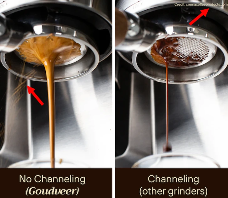 The photo presented by the Kickstarter project authors to prove that their grinder, the Goudveer F1, does not cause channeling is actually a photo of channeling. A credit in the top right indicates the source of the image and refers to an article from “cremacoffeeproducts.com” that explains what channeling is. However, this article does not seem to relate to the Kickstarter coffee grinder.