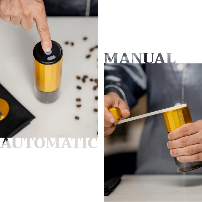 The Goudveer F1 is an innovative coffee grinder that combines the advantages of a manual grinder and an electric grinder. Thanks to its compact size and rechargeable battery, it can be taken anywhere to enjoy freshly ground coffee. Here are some of its key features: