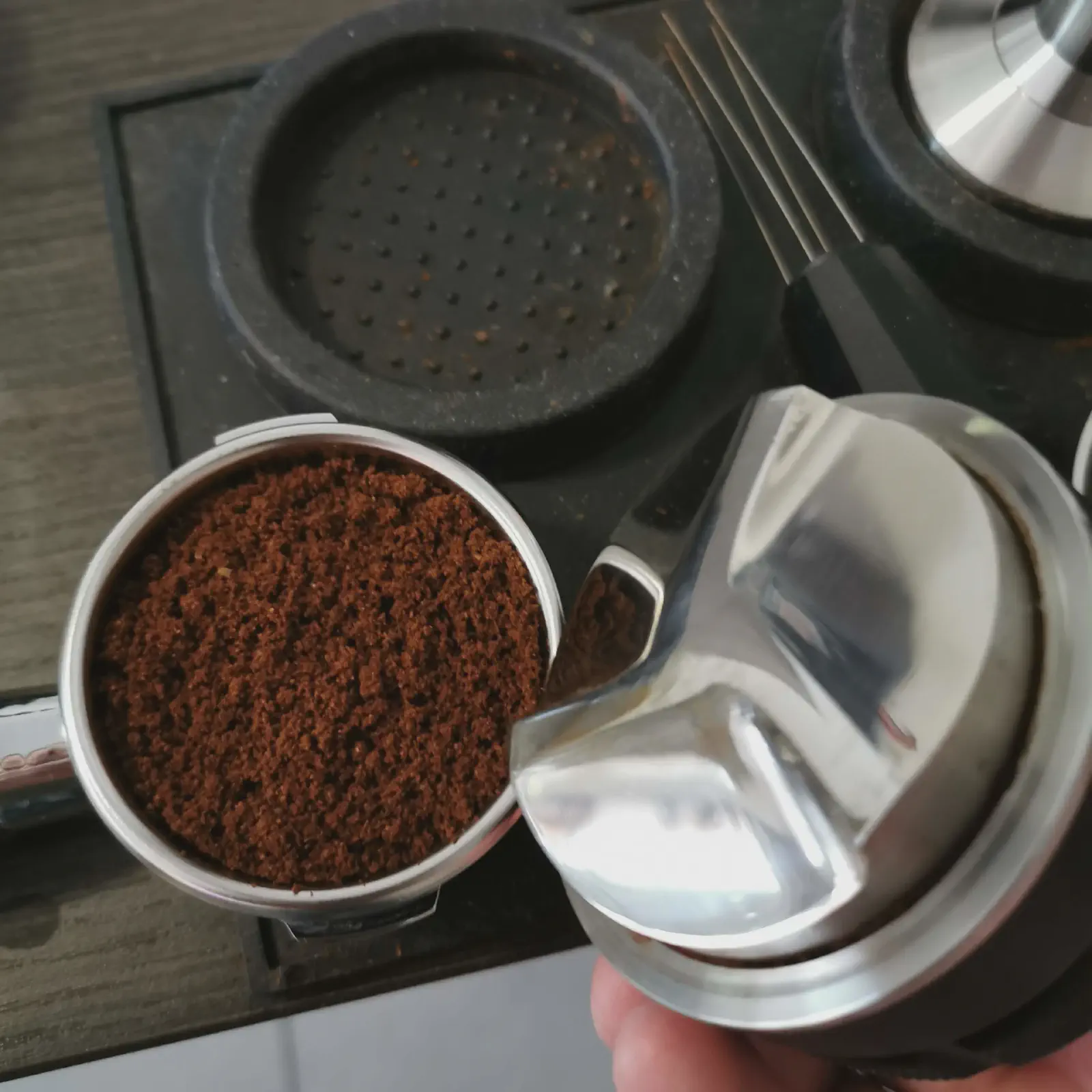 For a long time, I used a standard tamper purchased on Amazon for a few euros. Later, I invested in a model equipped with a guide, the Normcore V4 tamper, to ensure level tamping and consistently identical pressure.