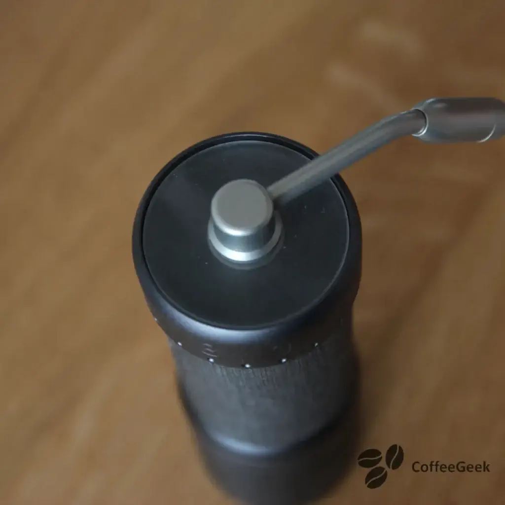 その後、ハンドルを展開し、挽き始めます。参考までに、このミルでコーヒー18gを挽くために、次の設定を使用しています:ダイヤルを1回転させてから1.0の位置。コーヒー全体を挽くのに40秒から50秒かかりました。