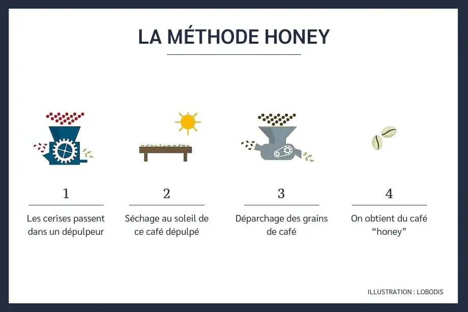 この方法は、湿式発酵から得られる香りの利点を保持することを目的としています。同時に、水の消費に関して環境に配慮した視点を採用しています。実際、湿式法はウォッシュド法よりも実施が簡単であり、果実をより尊重しているように思われます。こうしてチェリーは果肉除去されますが、タンクで発酵させてから洗浄する代わりに、豆はすぐに乾燥させられます。