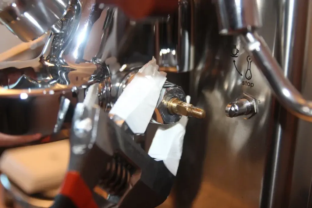 - 大きなナットを外します。大きなモンキーレンチを使用します。レンチに複数層のビニールテープを巻いてコーヒーマシンを保護します。