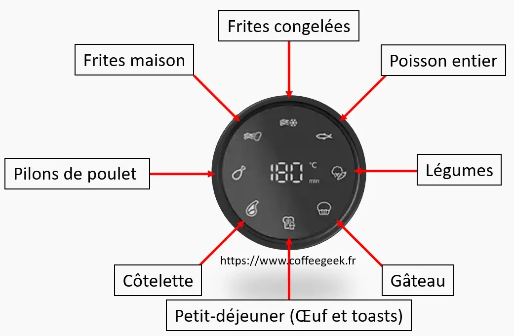 事前登録された調理モードは、タッチスクリーンの周りに組み込まれており、残り時間または温度を定期的に表示します。